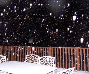 I turn on the outside light and watch the snow gyroscope in the intruding glow, the wind lifting and circling the flakes, making it look like they will never be allowed to touch the ground.