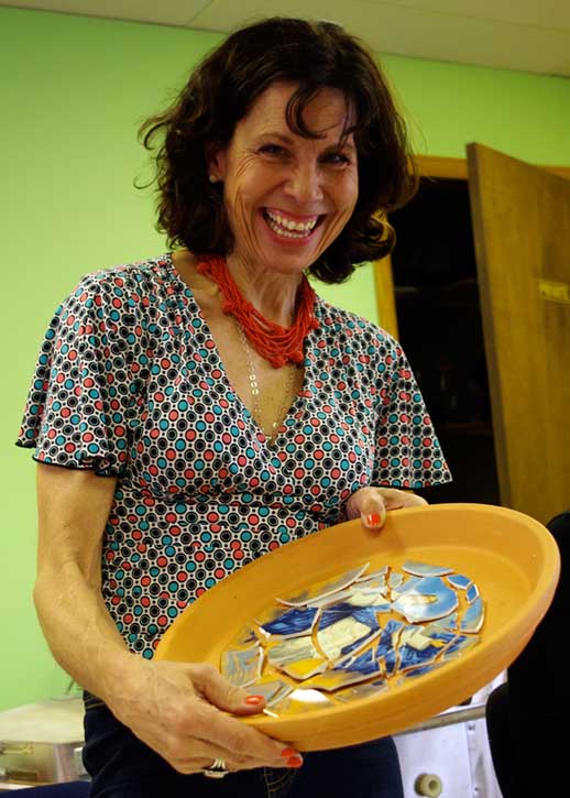 While using our own plates was a marvelous idea, in reality there were issues. Like plates are not flat and some areas are thicker than others. Cheryle’s plate was even thicker than mine and it was difficult to cut up. My plate was already broken, but I had to cut it into smaller places and remove parts that wouldn’t lay right. So while others were busily gluing, Cheryle and I spent a great deal of time wrestling with cutting.