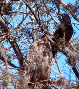 We saw that with the Great Horned Owls here (and the one in your photo I think is a great horned one) as well – the crows went crazy around them and they didn’t mind. Sometimes they just killed one…